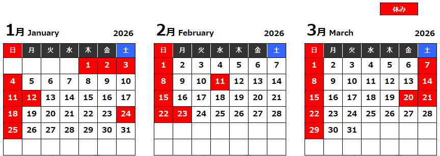 1月から3ヵ月間の当社の休日カレンダーです。